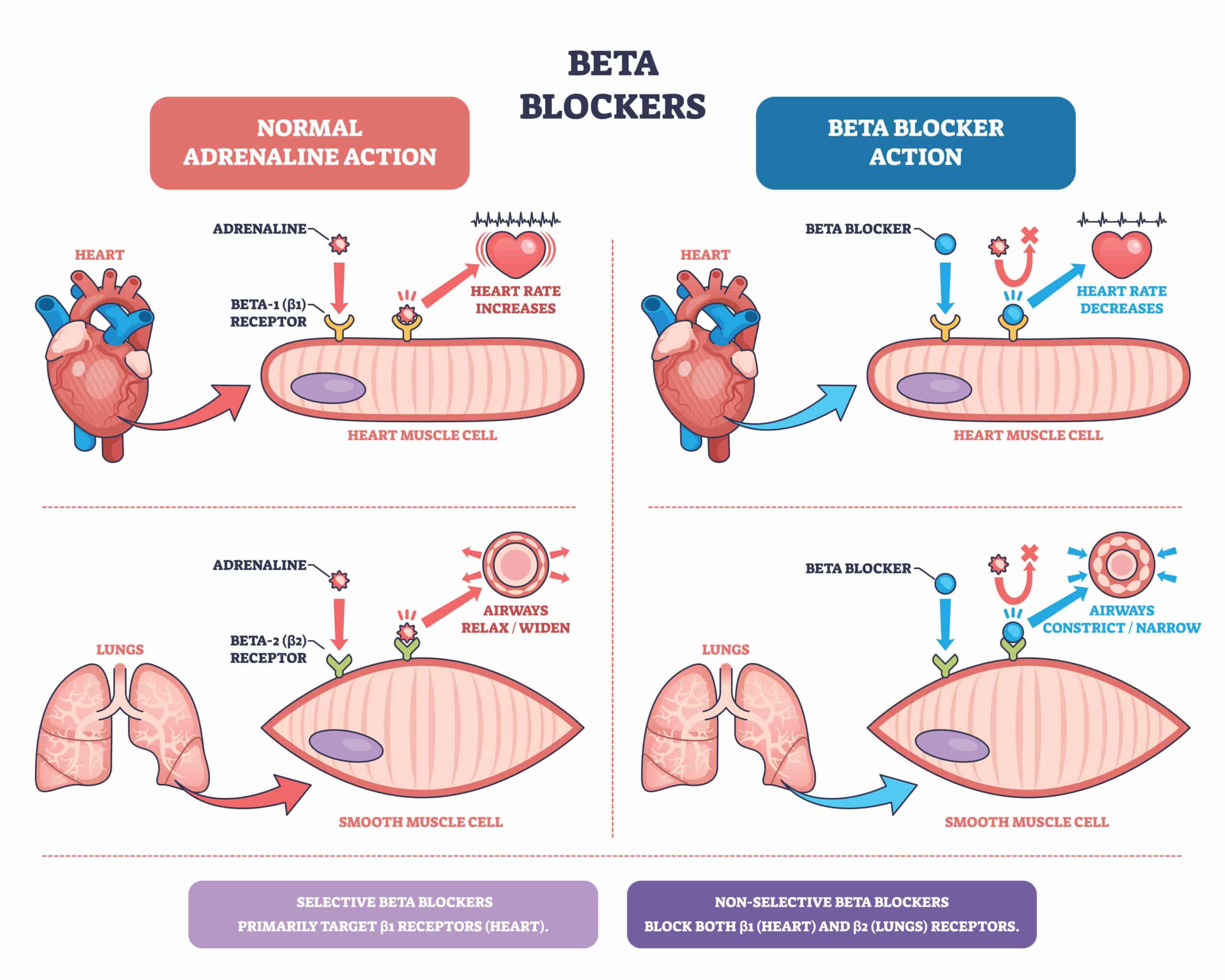 β-adrenoreceptor antagonists, commonly known as beta-blockers, are widely used pharmacological agents in the management of hypertension, arrhythmias, heart failure, and angina, as well as non-cardiac conditions such as migraine prophylaxis and anxiety.This article outlines the pharmacology, mechanism of action, and key prescribing principles of beta-blockers. Mechanism of Action β-adrenoreceptors are a subtype of G-protein-coupled receptors (GPCRs). When endogenous catecholamines (adrenaline and noradrenaline) bind to these receptors, the Gs-protein is de-coupled, leading to: Activation of adenylyl cyclase Conversion of ATP to cyclic AMP (cAMP) Activation of downstream intracellular pathways There are three β-adrenoreceptor subtypes: β1, β2, and β3. This article focuses on β1 and β2 receptors, which are most clinically relevant to cardiovascular pharmacology. Receptor Location Physiological Effect β1 Heart Increased heart rate (chronotropy) and contractility (inotropy) β1 Juxtaglomerular cells (kidney) Increased renin secretion β2 Bronchi Bronchodilation β2 Uterus Smooth muscle relaxation β2 Blood vessels Vasodilation β2 Detrusor muscle Bladder relaxation Table 1 – β-Adrenoreceptor Distribution and Effects Beta-blockers exert their therapeutic effects primarily by antagonising β1 receptors in the heart, reducing heart rate, myocardial contractility, and oxygen demand. Cardiac myocytes express both β1 and β2 receptors, with β1 receptors predominating. Activation of β1 receptors increases intracellular cAMP, which: Activates protein kinase A (PKA) Phosphorylates L-type calcium channels Increases calcium influx into the cell Calcium entry triggers calcium-induced calcium release (CICR) from the sarcoplasmic reticulum via ryanodine receptors, increasing intracellular calcium available to bind troponin C, thereby enhancing myocardial contractility (positive inotropy). By blocking β1 receptors: cAMP production is reduced Calcium influx decreases Heart rate (negative chronotropy) and contractility (negative inotropy) are reduced At the sinoatrial node, beta-blockers reduce the slope of the pacemaker potential, slowing impulse generation. This explains their role in rate control for arrhythmias, such as atrial fibrillation. Pharmacodynamics Beta-blockers are classified as: β1-selective (cardioselective) Non-selective (β1 and β2 blockade) The loss of β1 selectivity increases the likelihood of β2-mediated adverse effects, such as bronchospasm and peripheral vasoconstriction. Drug β1 receptor β2 receptor Key Indications Atenolol Yes No Hypertension, arrhythmias, migraine prophylaxis Bisoprolol Yes No Hypertension, angina, heart failure Metoprolol Yes No Hypertension, angina, arrhythmias, migraine Propranolol Yes Yes Hypertension, angina, arrhythmias, anxiety, post-MI, variceal bleed prophylaxis Labetalol Yes Yes Hypertension in pregnancy Acebutolol Yes No Hypertension, angina, arrhythmias Nebivolol Yes No Hypertension, heart failure Carvedilol Yes Yes Hypertension, angina, heart failure Table 2 – Common Beta-Blockers and Receptor Selectivity Mnemonic for β1-selective drugs:AB MAN – Atenolol, Bisoprolol, Metoprolol, Acebutolol, Nebivolol Fig 1: Beta blockers diagram showing the mechanism of how these drugs reduce heart rate and constrict airways by blocking beta receptors in heart and lungs Pharmacokinetics Beta-blockers are well absorbed orally, but first-pass metabolism may reduce bioavailability Lipophilic agents (e.g. propranolol, metoprolol, labetalol): Hepatically metabolised Greater CNS penetration → sleep disturbances Hydrophilic agents (e.g. atenolol): Renally excreted Lower CNS side-effect profile Dose adjustment may be required in renal or hepatic impairment, depending on drug choice. Carvedilol is contraindicated in patients with clinically manifest hepatic impairment. Drug Absorption Protein Binding Distribution Metabolism Excretion Half-life Atenolol F=40–50%; Tmax 2–4 h ~3% Low lipophilicity, poor tissue & CNS penetration Crosses into placenta and into breast milk Minimal hepatic metabolism Renal (>~90% unchanged) ~6 h (↑ in renal impairment) Bisoprolol F~90%; minimal first pass effect ~30% Vd 3.5 L/kg 50% metabolised by liver → inactive metabolites 50% renal unchanged, 50% renal inactive metabolites 10–12 h (up to ~17 h in CHF) Labetalol Well absorbed however significant first pass F~25% Tmax = 1-2h ~50% Poor CNS penetration, crosses placental barrier and excreted into breast milk Hepatic glucuronidation Urine + bile (as metabolites) ~4 h Nebivolol Rapid absorption; F ~12% (fast metabolisers), ~100% (slow) – dose must be adjusted on individual response ~98% Excreted into breast milk Extensive hepatic (CYP2D6); active metabolites Urine (~38%) + faeces (~48%) ~10 h (fast), 3–5× longer (slow) Metoprolol Complete absorption; F ~50% (↑ to ~70% with food) Tmax 1.5-2hours 5–10% Lipophilic; crosses placenta & into milk Hepatic (CYP2D6) → inactive metabolites Renal (>95%, ~5% unchanged) ~3.5 h Propranolol Complete absorption; extensive first pass (~90%) Tmax 1-2 h 80–95% Highly lipophilic, wide tissue & CNS distribution, passes into breast milk Extensive hepatic metabolism (90%) Renal (metabolites) 3–6 h (IV ~2 h) Carvedilol F=25% Tmax ~1 h 98–99% Highly lipophilic; Vd ~2 L/kg Extensive hepatic glucuronidation; active metabolites Mainly biliary/faecal (~60%); 16% renal ~6 h (IV ~2.5 h) Cautions and Contraindications Abrupt withdrawal of beta blockers may cause rebound tachycardia and hypertension due to β-receptor upregulation. Conversely beta blockers are contraindicated in symptomatic bradycardia (often withheld if HR <50 bpm, contraindicated if HR <45bpm). Specifically, in liver cirrhosis carvedilol levels increase by about 80% due to reduced first-pass metabolism; therefore, it is contraindicated in those with significant liver impairment. Other cautions and contraindications are listed below: Hypoglycaemia masking: β-block