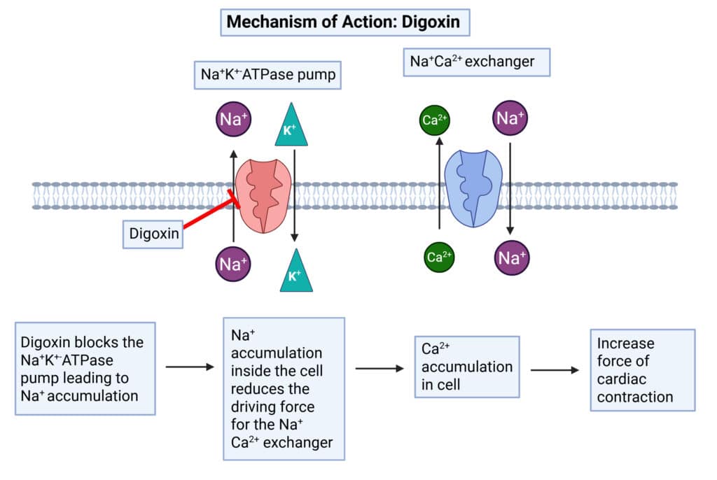 Digoxin is a cardiac glycoside derived from the foxglove plant, Digitalis purpurea, and has been used in cardiovascular medicine for over two centuries. Despite the development of many newer therapies, digoxin continues to have a defined role in modern clinical practice, particularly in the management of supraventricular arrhythmias and heart failure with reduced ejection fraction (HFrEF). In heart failure, it does not confer a mortality benefit; however, it improves symptoms and reduces hospital admissions. In atrial arrhythmias, its principal benefit lies in controlling ventricular rate, especially in sedentary individuals. This article summarises the key pharmacological principles underpinning digoxin therapy, with emphasis on its narrow therapeutic index and renal elimination. It also outlines therapeutic drug monitoring, describes adverse effects, and reviews important cautions, contraindications, and clinically significant drug interactions, providing a concise overview of its clinical use and safety considerations. Mechanism of Action Digoxin enhances myocardial contractility through a direct, dose-dependent effect, with measurable activity even at relatively low doses. Its primary mechanism is inhibition of the sodium-potassium ATPase (Na⁺/K⁺-ATPase) pump. This inhibition alters transmembrane ionic gradients, increasing Na+ and indirectly increasing intracellular calcium via the sodium-calcium exchange pump. The resulting rise in intracellular calcium enhances excitation-contraction coupling and strengthens cardiac muscle contraction. The drug’s effects are influenced by serum potassium levels; hypokalaemia potentiates digoxin’s action, while hyperkalaemia reduces its effectiveness. This is due to reduced competition at the K⁺-binding site on the Na⁺/K⁺-ATPase. In addition to its direct myocardial effects, digoxin acts on the autonomic nervous system by inhibiting Na⁺/K⁺-ATPase in neural tissue. This increases vagal (parasympathetic) tone and reduces sympathetic activity, leading to slowed conduction through the atria and atrioventricular node. Clinically, its most important therapeutic benefit is reduction of ventricular rate, particularly in atrial arrhythmias. Created in BioRender. Boucher, M. (2026) https://BioRender.com/7csu5zp Fig 1: Mechanism of action of digoxin Pharmacokinetics Digoxin is moderately well absorbed after oral administration, with bioavailability of ~63% (tablets) and ~75% (oral solution). Due to its narrow therapeutic index, dose adjustment is required when switching from oral to IV formulations, with a 33% dose reduction suggested by manufacturers. Following intravenous loading, pharmacological effects typically appear within 5–30 minutes. After oral administration, onset of action generally occurs within 30 minutes to 2 hours. Food slows absorption, and high-fibre meals may reduce the total amount absorbed. It has a large volume of distribution and accumulates extensively in tissues, particularly the heart, while only about 25% is plasma protein bound. Digoxin undergoes minimal metabolism, with most of the drug excreted unchanged by the kidneys. Digoxin is a polar drug of which most remains in the renal tubule lumen and is not reabsorbed, meaning that renal elimination is the main factor that determines its duration of action. The terminal half-life in patients with normal renal function is 30–40 hours, whereas in patients with renal impairment it can be up to 100 hours. In clinical terms, this means that digoxin doses should be reduced in renal impairment. Digoxin is a substrate for P-glycoprotein, which influences both intestinal absorption and renal elimination. Due to its long half life, digoxin requires loading doses in urgent situations to reach therapeutic levels. If a slow digoxin regimen is followed (initiating at a maintenance dose without a loading dose), steady state levels will be achieved after 7-10 days in the average patient (~five times the half life). Absorption Distribution Metabolism Excretion Oral Tmax: 2–6 h; IV Tmax: 1–5 h. Absorbed from stomach and upper small intestine. Bioavailability ~63% (tablets), ~75% (solution). Food slows rate but not extent; high-fibre meals may reduce absorption. Substrate for P-glycoprotein (P-GP) (limits absorption as an efflux protein on apical membrane of enterocytes). Large Vd (~510 L). Extensive tissue binding; highest levels in heart (≈30× plasma), also liver and kidney. Distributes widely to skeletal muscle – decreased in elderly (may lead to increased serum levels in pts with low muscle mass) ~25% plasma protein bound. Minimal metabolism. Small fraction is converted to active/inactive metabolites (e.g., dihydrodigoxin, digoxygenin). Primarily renal excretion of unchanged drug (60–75%). In some individuals, digoxin is converted by colonic bacteria to inactive products P-gp in renal proximal tubules increases renal clearance Terminal half-life 30-40 h (may be up to 100h in impaired renal function) Poorly removed by haemodialysis (~3% in 5 h). Table 1: Pharmacokinetics of Digoxin Monitoring Due to digoxin’s narrow therapeutic index, drug levels are required to be taken. Generally a trough level is taken, 6-24 hours after the last dose of digoxin and 7 days after a dose change or initiation of therapy. In heart failure, a suggested optimum trough level is 0.5-1mcg/L and in AF 0.5-2mcg/L. Toxicity is associated with levels >2mcg/L and likely with levels >3mcg/L Certain immunoassays (e.g., CMIA) may produce falsely elevated serum digoxin concentrations in patients receiving enzalutamide. Furthermore high doses of biotin (vitamin B7) can lead to falsely elevated digoxin concentrations using the luminescent oxygen channelling immunoassay (LOCI). If results are inconsistent with the clinical picture, confirmation with an alternative assay is recommended. Adverse Effects Adverse effects that can occur with digoxin are similar to the signs and symptoms of digoxin toxicity