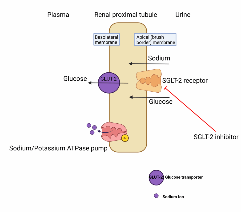 Sodium-glucose co-transporter-2 inhibitors (SGLT-2 inhibitors) are used to treat type 2 diabetes, cardiovascular disease, heart failure and chronic kidney disease (ertugliflozin is only licensed for type 2 diabetes in the UK). They are identified by the suffix -flozin, common examples include: Dapagliflozin Empagliflozin Canagliflozin Ertugliflozin ▼ Combination products also exist, such as: Xigduo = dapagliflozin + metformin Glyxambi = empagliflozin + linagliptin Mechanism of Action SGLT-2 inhibitors block the sodium-glucose co-transporter-2 protein in the proximal renal tubule of the nephron. Normal function of SGLT-2: reabsorbs glucose and sodium from the glomerular filtrate. Effect of inhibition: increased excretion of glucose → reduced blood sugar. Additional effects: Increased urinary excretion of sodium, osmotic diuresis and a reduced intravascular volume. Increased sodium delivery to the distal tubule may influence several physiological functions such as reducing fluid overload, blood pressure, and leading to a lower preload and afterload of the heart, improving cardiovascular outcomes. Promote weight loss (loss of calories through increased urinary excretion of glucose) Reduce pressure on the kidneys (reduces intraglomerular pressure), leading to a protective effect e.g. dapagliflozin was found to prevent reaching end-stage kidney disease, CV or renal death and a decline in eGFR compared to placebo Improve symptoms of heart failure e.g. breathlessness The glucose lowering effect of SGLT-2 inhibitors is dependent on renal function In patients with poor renal function, the glucose lowering effect is likely to be reduced, as the amount of filtrated glucose is small and can be absorbed by SGLT1 and unblocked SGLT2 transporters. For all of the described SGLT-2 inhibitors in this article, the glucose lowering efficacy is reduced in moderate renal impairment (if eGFR <45ml/min) and absent in severe renal impairment (if eGFR <30ml/min) The systemic exposure of dapagliflozin, canagliflozin and empagliflozin also increases as renal function deteriorates. Created in BioRender. Boucher, M. (2025) https://BioRender.com/ais3qdi Fig 1: mechanism of action of SGLT-2 inhibitors Pharmacokinetics SGLT-2 inhibitors are taken orally and once daily which is possible due to their high bioavailability and long half lives, respectively. SGLT-2 inhibitors are extensively distributed and mainly metabolised by UGT enzymes to inactive metabolites. Active and inactive metabolites are excreted via urine and faeces. The following table describes the specific pharmacokinetic parameters for each SGLT-2 inhibitor: Drug Absorption Distribution Metabolism Excretion Dapaglifozin (Forxiga) Tmax < 2 hours F = 78% Protein binding = 91% Vd = 118L UGT1A9 → inactive metabolites CYP-mediated metabolism is a also minor pathway Half life = 12.9 hours Primarily excreted via kidneys Empagliflozin (Jardiance) Tmax ~ 1.5 hours Protein binding = 86% Vd = 73.8L UGT enzymes Half life = 12.4 hours Urine 54%, faeces 41% Exposure increased in renal and hepatic impairment Canagliflozin Tmax – 1-2 hours F = 65% Reduces postprandial plasma glucose excursion (due to delayed intestinal glucose absorption) – take before first meal of day Protein binding = 99% Vd = 83.5L UGT enzymes → inactive metabolites Half life – 10-13 hours Urine 33%, faeces 52% Ertugliflozin (Steglatro) Tmax = 1 hour F = 100% Plasma protein binding = 93.6% Vd = 86L UGT enzyme → inactive metabolites CYP-mediated metabolism = 12% Half life = 17 hours Urine 50%, faeces 41% Adverse Effects and Cautions For Use Most commonly, SGLT-2 inhibitors lead to increased frequency of urinary tract infections and genital fungal infection (due to increase in glucose in urine). Serious complications such as diabetic ketoacidosis (DKA) have been reported with SGLT-2 inhibitor use. Caution should be applied with patients who have had previous diabetic ketoacidosis, and any risk factors should be addressed before commencing treatment. DKA may occur atypically, with only moderately increased blood glucose levels. Treatment should be held for patients undergoing surgery or in acute serious medical illness and monitoring of ketones should be undertaken Symptoms of DKA include: nausea, vomiting, abdominal pain, excessive thirst, difficulty breathing, confusion and sleepiness Risk factors for developing DKA with SGLT-2 inhibitor use include Low beta-cell function reserve i.e. type 2 diabetes with low C-peptide or latent autoimmune diabetes or hx of pancreatitis Restricted food intake Dehydration Patients with increased insulin requirements due to acute medical illness, surgery or alcohol intake Other possible effects: Hypoglycaemia when used with insulin or a sulphonylurea Increased urination Thirst Increase in serum lipids Constipation Increased haematocrit (dapagliflozin and empagliflozin) Transient and reversible (on discontinuation) increase in creatinine (dapagliflozin, empagliflozin, ertugliflozin) Risk of Fournier’s gangrene (necrotizing fasciitis of genitalia and perineum) in males and females Hyperkalaemia and hyperphosphatemia (canagliflozin) Cautions: Severe hepatic impairment and dapagliflozin (initiate at a lower dose) History of foot disease e.g. ulcer, peripheral arterial disease or lower limb amputation, due to increased risk of lower limb amputation Elderly, diuretic/antihypertensive use, renal impairment → risk of hypotension/volume depletion Contraindications DKA Manufacturers make varying recommendations on renal function cut offs for each SGLT-2 inhibitor, although dapagliflozin and empagliflozin are licensed in the treatment of chronic kidney disease. Dapagliflozin: do not initiate if eGFR<15ml/min/1.73m2 Empagliflozin: do not initiate if eGFR <20ml/min/1.73m2 (reduce dose if eGFR<60ml/min/1.73m2) Canagliflozin: do not initiate if eGFR <30ml/min/1.73m2 (max dose 100mg daily if eGFR<60ml/min/1.73m2) Ertugliflozin: do not initiate if eGFR <45ml/min/1.73m2