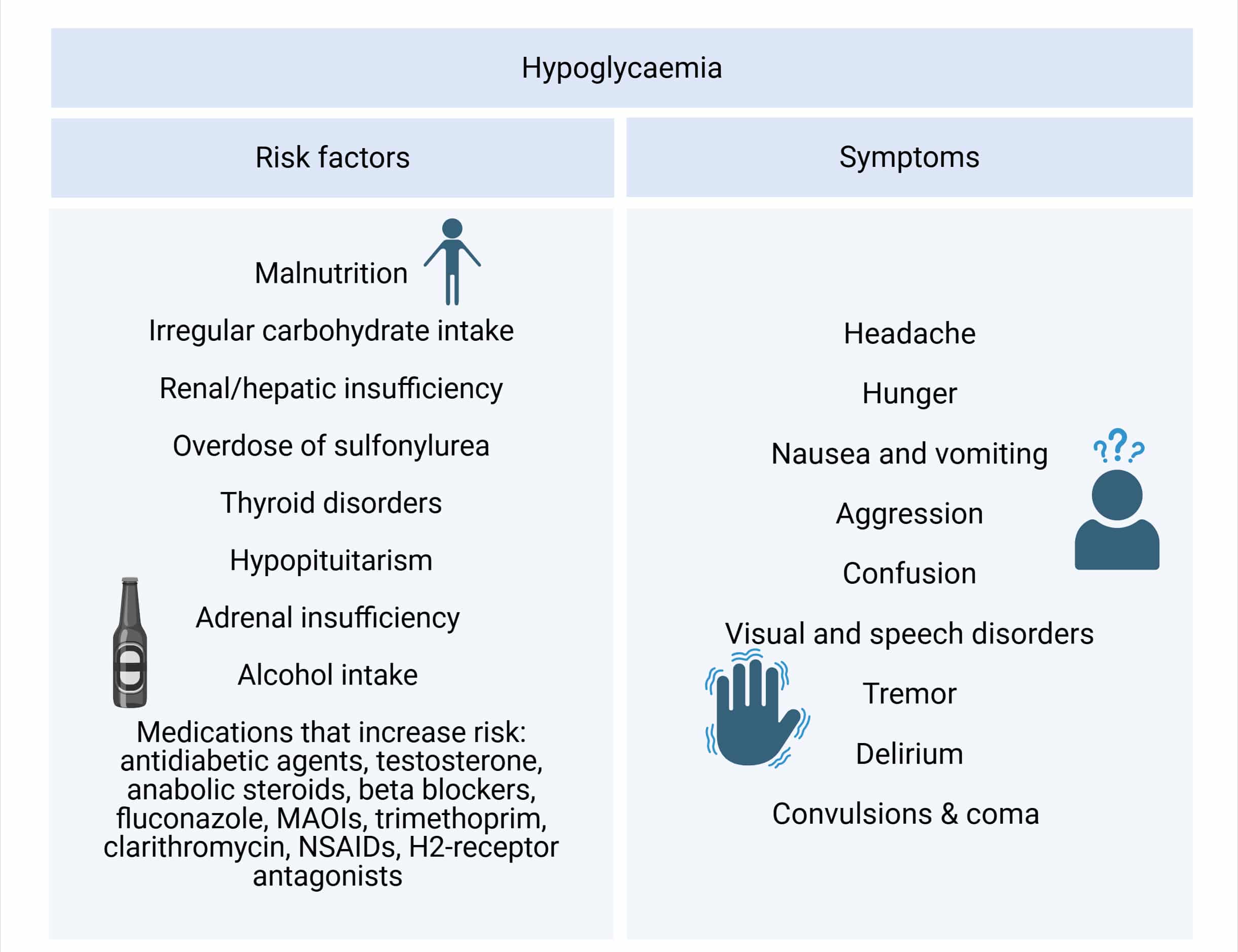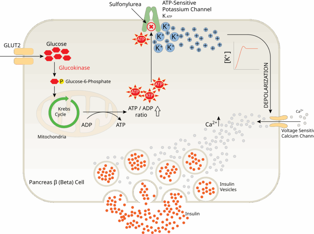 Sulfonylureas are oral antidiabetic agents used in the management of type 2 diabetes mellitus. They share the suffix “-ide”, and include gliclazide, glibenclamide, glimepiride, glipizide, and tolbutamide. This article explains the mechanism of action, cautions and contraindications, side effects, and drug interactions relevant to this class of medication. Mechanism of Action Sulfonylureas stimulate insulin secretion from pancreatic β-cells, therefore are only effective when there is some residual pancreatic β-cell activity present. They work by binding to and blocking ATP-sensitive potassium channels on pancreatic beta cells, causing accumulation of intracellular potassium and depolarisation of the cell. This leads to opening of calcium channels, calcium influx into the cell, and subsequently insulin release through exocytosis. Additionally, glimepiride increases glucose transport molecules on the plasma membranes of muscle and fat cells, enhancing glucose uptake and utilisation. Aydintay, Public domain, via Wikimedia Commons Fig 1: Sulfonylureas, mechanism of action Cautions and Contraindications Cautions Contraindications Obesity – can cause further weight gain Elderly or malnourished – higher risk of hypoglycaemia, especially with longer-acting agents (glibenclamide, glimepiride) G6PD deficiency – can lead to haemolytic anaemia Acute porphyria (glibenclamide, gliclazide, and tolbutamide) Ketoacidosis Type 1 diabetes Severe renal/hepatic impairment – insulin is recommended Renal and hepatic impairment Renal impairment increases the risk of hypoglycaemia. If use is necessary: Tolbutamide (short-acting) and gliclazide (mainly hepatic metabolism) are preferred. Insulin is recommended in severe impairment. Hepatic impairment increases hypoglycaemia risk, particularly with glipizide. Adverse Effects One of the most clinically relevant side effects of sulfonylureas is hypoglycaemia, which is defined as a blood sugar level below 4mmol/L. By TeachMeSeries Ltd (2026) Fig 2: Risk factors for and symptoms of hypoglycaemia Other side effects: Gastrointestinal: transient diarrhoea with glibenclamide Hepatic impairment Skin: rash, angioedema, itching, photosensitivity, stevens-johnson syndrome (glibenclamide) Blood: leucopenia, thrombocytopenia, agranulocytosis, pancytopenia, haemolytic anaemia Electrolytes: hyponatraemia (gliclazide, glipizide) Interactions Beta blockers – mask signs of hypoglycaemia such as tremor (interaction is applicable to all antidiabetic agents) Medications that may reduce efficacy of sulfonylureas include: Medications that may antagonise the blood glucose lowering effects of sulfonylureas: danazol, chlorpromazine, glucocorticoids, diuretics, oestrogens and progesterones Colesevelam reduces absorption of glibenclamide, glimepiride and glipizide – take 4 hours before or after colesevelam (take 4 hours before for glimepiride) Sulfonylureas are metabolised by CYP2C9, therefore CYP2C9 inducers such as rifampicin and St John’s wort may reduce the plasma concentration of sulfonylureas Medications that may enhance the blood glucose lowering effects of sulfonylureas include: Alcohol, anabolic steroids, ACE-inhibitors, chloramphenicol, cimetidine, coumarins, MAOIs, NSAIDs, testosterone, tetracyclines and trimethoprim Highly protein bound drugs may displace glibenclamide (99% bound to albumin) from plasma proteins and therefore potentiate the hypoglycemic effect e.g. phenytoin, NSAIDs, oral anticoagulants Sulfonylureas are metabolised by CYP2C9 therefore CYP2C9 inhibitors such as fluconazole and miconazole may increase the plasma concentration of sulfonylureas Miconazole use is contraindicated with gliclazide & glipizide Tolbutamide transiently increases plasma concentrations of phenytoin and fosphenytoin References Sulfonylureas | Prescribing information | Diabetes – type 2 | CKS | NICE AMGLIDIA 0.6 mg/mL oral suspension with 5 mL oral syringe – Summary of Product Characteristics (SmPC) – (emc) Gliclazide 80 mg Tablets – Summary of Product Characteristics (SmPC) – (emc) Glimepiride 1 mg tablets – Summary of Product Characteristics (SmPC) – (emc) Minodiab 5mg Tablets – Summary of Product Characteristics (SmPC) – (emc) Tolbutamide Tablets BP 500 mg – Summary of Product Characteristics (SmPC) – (emc) Didari E, Sarhangi N, Afshari M, Aghaei Meybodi HR, Hasanzad M. A pharmacogenetic pilot study of CYP2C9 common genetic variant and sulfonylureas therapeutic response in type 2 diabetes mellitus patients. J Diabetes Metab Disord. 2021 Sep 14;20(2):1513-1519. doi: 10.1007/s40200-021-00894-0. PMID: 34900803; PMCID: PMC8630254 Do you think you’re ready? Take the quiz below Pro Feature - Quiz Sulfonylureas Question 1 of 3 Submitting... Skip Next Rate question: You scored 0% Skipped: 0/3 More Questions Available Upgrade to TeachMePharmacy Pro Challenge yourself with over 2100 multiple-choice questions to reinforce learning Learn More Rate This Article