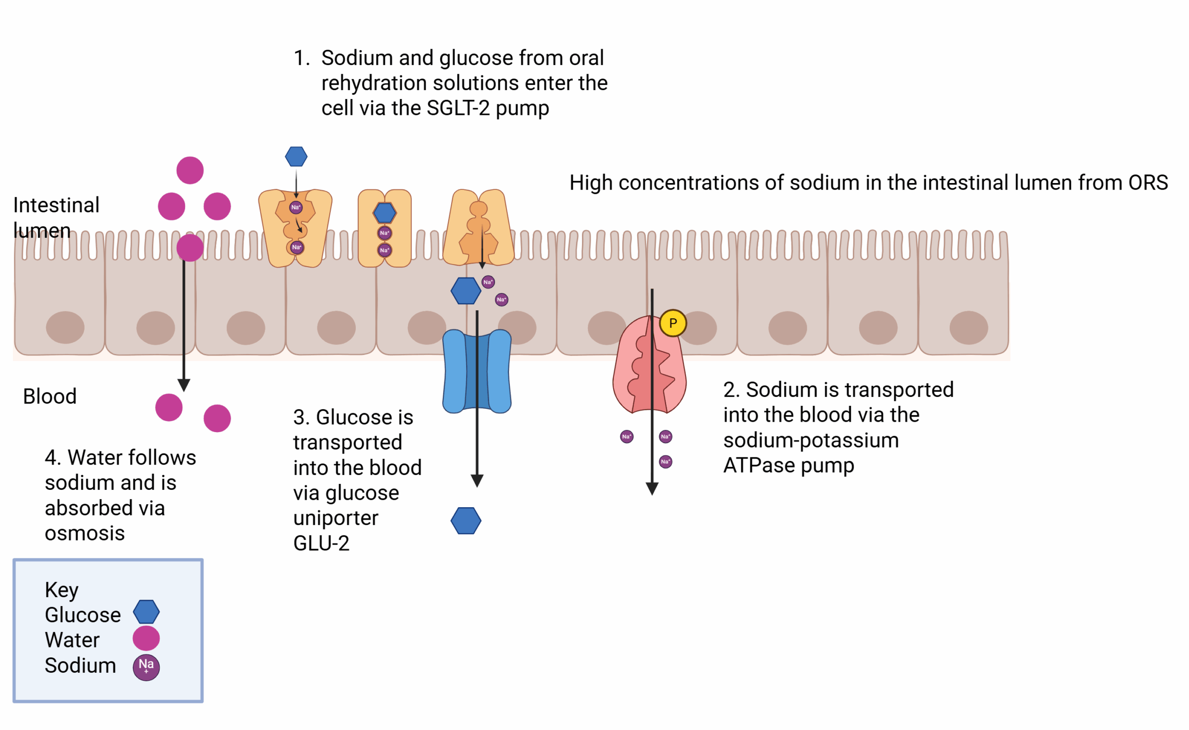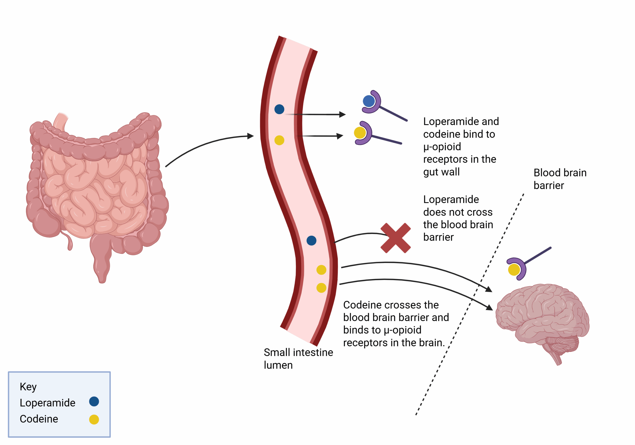 Diarrhoea is defined as the abnormal passing of loose or liquid stools, with increased frequency and/or volume. Common causes for diarrhoea include infection, chronic gastrointestinal disorders and newly initiated medication. Red flag symptoms such as unexplained weight loss, rectal bleeding, systemic illness, recent hospital treatment or antibiotics and recent foreign travel (other than Western Europe, North America, Australia or New Zealand) should be investigated for new onset diarrhoea. This article will outline some causative factors of diarrhoea and outline treatment options such as oral rehydration therapy and antimotility therapy, including the mechanism of action, side effects, cautions and contraindications and any clinically significant drug-drug interactions. Causative Factors Clostridium difficile (C.difficile) C.difficile infection occurs when normal gut microbiota are suppressed, allowing levels of toxin producing strains of C. difficile to increase. The toxin damages the lining of the colon and causes diarrhoea. There is a higher risk of C.difficile infection after prolonged antibiotic usage (especially broad spectrum antibiotics) and/or hospital admissions. Antibiotics such as vancomycin (PO) and fidaxomicin (PO) are commonly used to treat C.difficile. Vancomycin is a tricyclic glycopeptide antibiotic that inhibits the synthesis of the cell wall in sensitive bacteria. When vancomycin is taken orally, it is not absorbed into the systemic circulation and acts locally on the intestinal mucosa. Fidaxomicin is a narrow spectrum antimicrobial drug with bactericidal activity against c.difficile and inhibits RNA synthesis by bacterial RNA polymerase. Fidaxomicin is also poorly absorbed from the GI tract so is only indicated in c.difficile infections where it acts locally on the gut mucosa. Proton pump inhibitors or H2 receptor antagonists should be stopped unless there is a clear indication, as both drug classes suppress gastric acid secretion and may contribute to growth of the c.difficile strain. Medication Newly initiated medications should be considered as potential causes for new diarrhoea. Medications that can cause diarrhoea include: Broad spectrum antibiotics – consider C.difficile Metformin (consider switching to modified release preparation to help with GI upset) Colchicine Levothyroxine Iron Magnesium NSAIDs Orlistat Proton pump inhibitors Metoclopramide Laxatives Oral Rehydration Therapy Oral rehydration therapy involves use of a combination of electrolytes that stimulate water and electrolyte absorption from the GI tract, therefore preventing or reversing dehydration in diarrhoea. A commonly seen example is Dioralyte sachets which contain sodium, potassium and glucose. The mechanism of action of Dioralyte is described as follows: Sodium and glucose are actively transported via the sodium-glucose transporter pump into the enterocytes. Sodium is then extruded into the intercellular spaces and the resulting osmotic gradient causes water and electrolytes to be reabsorbed from the gut and into the circulation. Oral rehydration therapy contains sodium and should therefore be used with caution in patients on a low-sodium diet. Furthermore, Dioralyte contains potassium, so it should be used cautiously in patients at risk of hyperkalaemia. Alternative oral rehydration therapies that do not contain potassium, such as St Mark’s Solution, are available (unlicensed). In high stoma output and/or short bowel syndrome, Dioralyte is often used at double the concentration (i.e. 1 sachet in 100ml of water rather than 1 sachet in 200ml of water) to increase absorption of water and electrolytes across the gut lumen and reduce the stoma output, this is off label use. Created in BioRender. Boucher, M. (2025) https://BioRender.com/om4zdiuFig 1: Mechanism of action of oral rehydration solutions Antimotility Therapy The mainstay of antimotility therapy includes loperamide and codeine. Loperamide is preferred over codeine for the treatment of diarrhoea due to the risk of drug dependence and withdrawal effects if therapy is stopped, alongside risk of respiratory depression and death in overdose. Loperamide Loperamide is a synthetic opioid which inhibits gut motility by binding to opiate receptors in the gut wall. Loperamide does not cross the blood brain barrier therefore does not elicit the analgesic effect seen with opiates. Cautions for use of loperamide include: Loperamide should be avoided in suspected inflammatory diarrhoea, confirmed bacterial enterocolitis caused by invasive organisms and in pseudomembranous colitis associated with the use of broad- spectrum antibiotics. In overdose or in high doses of >16mg/day (common when used for high output stoma) ECG monitoring is advisable. Cardiac events including QT interval, QRS complex prolongation and torsades de pointes have been reported in overdose. Codeine Codeine can also be used to treat diarrhoea and high output stoma. Codeine crosses the blood brain barrier therefore acts at central and peripheral μ-opioid receptors, meaning it does ilicit an analgesic effect and can cause dependence. Codeine is metabolised in the liver to form morphine via enzyme CYP2D6 as shown in figure 1 below. There is a risk that ultrarapid metabolizers of codeine will have more rapid and complete metabolism of codeine to morphine leading to increased risk of overdose. Codeine is contraindicated in breastfeeding mothers due to the risk of ultrarapid metabolizers producing breast milk with higher levels of morphine Created in BioRender. Boucher, M. (2025) https://BioRender.com/2b9t0th Fig 2: Mechanism of action of anti-motility agents References BNF online Diarrhoea (Acute) available from Diarrhoea (acute) | Treatment summaries | BNF | NICE accessed 13/8/24 SPC Loperamide Last updated on emc: 04 Aug 2023. Available from https://www.medicines.org.uk/emc/product/10420/smpc accessed 15/8/24 SPC Dioralyte blackcurrant sachets. Last updated on emc: 18 Jan 2024.