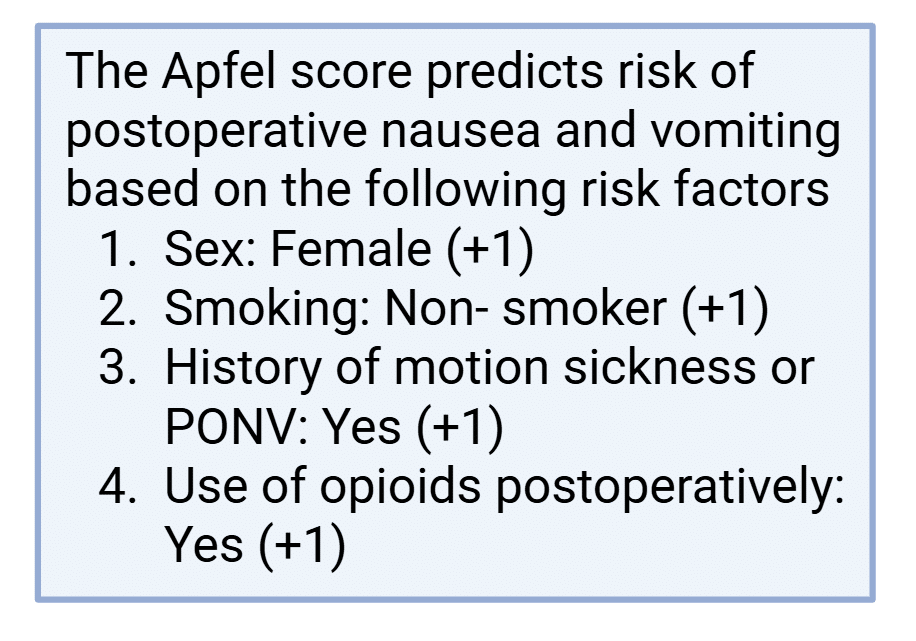 Antiemetics are used to treat nausea and vomiting Neurotransmitters such as dopamine, serotonin, histamine, acetylcholine, and neurokinin are involved in the control of nausea and vomiting via activation of receptors in the chemoreceptor trigger zone (CTZ) and in the vomiting centre, both of which are located in the medulla. The CTZ is situated outside of the blood brain barrier therefore is more likely to be activated by compounds such as chemotherapy. Antiemetics block activation of these receptors, inhibiting stimulation of the gastrointestinal (GI) tract, diaphragm, and abdominal muscles. This article describes the general management of nausea and vomiting and focuses on antiemetic drug classes, their mechanisms of action, clinically relevant side effects, cautions for use, and interactions. Licensed dosing schedules are available via the BNF or summary of product characteristics via the EMC. Created in BioRender. Boucher, M. (2025) https://BioRender.com/0hbgwpu Fig 1: Mechanism of action of antiemetics General management There are several underlying conditions which precipitate nausea and vomiting, which also affects treatment choice. Gastric stasis Drugs which have a prokinetic effect can be used for nausea and vomiting induced by gastric stasis (unlicensed in the UK). Most commonly, dopamine antagonists metoclopramide and domperidone are used. The antibiotic erythromycin also has prokinetic activity. Prokinetics (metoclopramide and domperidone) should not be given concurrently with drugs with antimuscarinic activity (e.g., cyclizine, hyoscine) because antimuscarinic drugs competitively block the action of prokinetics. Motion sickness/Labyrinth disorders/Vertigo Antihistamines such as cyclizine, cinnarizine, prochlorperazine and hyoscine butylbromide are most commonly used Palliative care Several classes of antiemetics can be used in palliative care, the class used may depend on whether there is a known precipitating factor causing the nausea and vomiting i.e. chemotherapy or gastric stasis, and the route of administration available. Commonly used antiemetics in palliative care include haloperidol, levomepromazine, cyclizine and dexamethasone. Chemotherapy-induced nausea 5HT3 receptor antagonists such as ondansetron and granisetron, aprepitant and dexamethasone are often used for chemotherapy induced nausea and vomiting Nausea and vomiting during pregnancy Antiemetics should be considered for persistent symptoms where self-care measures are not effective. Few drugs are licensed in pregnancy in the UK, however use is based on established practice. However, xonvea is licensed for use in the UK for nausea and vomiting during pregnancy. Xonvea comprises of doxylamine succinate (a first generation antihistamine) and pyridoxine hydrochloride (vitamin B6), both of which contribute to the antiemetic effect. Common antiemetics used in pregnancy include: chlorpromazine hydrochloride, cyclizine, metoclopramide, prochlorperazine, promethazine hydrochloride, promethazine teoclate, and ondansetron. Postoperative nausea and vomiting (PONV) Drugs commonly used in PONV include 5HT3 receptor antagonists, dexamethasone, cyclizine and prochlorperazine. By TeachMeSeries Ltd (2026) Fig 2: Apfel score Antiemetic classes Dopamine receptor antagonists Dopamine receptor antagonists, such as metoclopramide and domperidone, block dopamine type 2 (D2) receptors centrally in the chemoreceptor trigger zone and peripherally in the gastrointestinal tract. Domperidone and metoclopramide also stimulate gastric emptying as described above. Metoclopramide crosses the blood-brain barrier (domperidone does not), therefore is not recommended in Parkinson’s disease where there is a lack of dopamine in the brain. Metoclopramide can also induce acute dystonic reactions which are more likely in younger or elderly patients and females. Domperidone should be used with caution in patients with a cardiovascular history, as it can cause QT interval prolongation, and there is an increased association with ventricular tachyarrhythmias and sudden cardiac death, which is more likely to be seen at higher doses (>30mg daily) and in older patients (>60yrs). First-generation antipsychotics such as levomepromazine, chlorpromazine, haloperidol and prochlorperazine are also D2 receptor antagonists and can have an antiemetic effect. Alongside being cautioned in use with patients with Parkinson’s disease, and risk of QT prolongation, these drugs have additional side effects such as weight gain, hyperprolactinaemia, hyperglycaemia and urinary retention due to activity at additional receptors such as α -adrenoceptors. Antihistamines Antihistamines such as cyclizine, cinnarizine and promethazine are often used in nausea and vomiting related to motion sickness/labyrinth disorders/vertigo. Antihistamines block H1 receptors, as well as muscarinic receptors*. Promethazine also blocks D2 receptors. Blocking muscarinic receptors leads to anticholinergic side effects such as dry mouth, urinary retention, movement disorders, blurred vision, drowsiness, constipation and arrhythmias. Promethazine can also cause QT prolongation. Caution should be taken with IV cyclizine which can cause a euphoric effect when administered. Furthermore, if cyclizine is used in a syringe driver; it should not be mixed with 0.9% NaCl as this can cause precipitation. *Cinarrizine, cyclizine, promethazine all block muscarinic receptors. 5HT3-receptor antagonists Serotonin receptor antagonists such as ondansetron and granisetron block 5-HT3 receptors in the vagal nerve terminals in the GI tract, in the CTZ and the vomiting centre in the brainstem. Both can cause QT prolongation, constipation, movement disorders and granisetron can also cause serotonin syndrome. Both are commonly used in chemotherapy- or radiotherapy-induced nausea and vomiting, as serotonin is the main neurotransmitter responsible for emesis after chemo or radiotherapy. Neurokinin antagonists Neurokinin anta