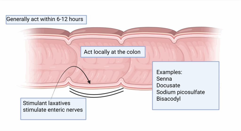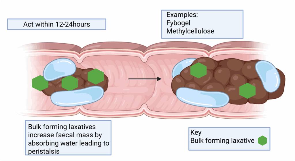 Laxatives are a group of diverse medications used in the pharmacological management of constipation. In this article, we shall look at the pharmacology of laxatives – their class, mechanism of action and routes of administration. Non-Pharmacological Measures Non-pharmacological measures are usually first-line in the management of constipation. This includes lifestyle modifications to increase dietary fibre, fluid intake and exercise. The Bristol stool chart can be referred to when discussing stool types. In addition, it is important to consider any newly started medications that may be causative. Such medications include: Ondansetron Loperamide Diuretics such as furosemide Antimuscarinic medications such as amitriptyline or oxybutynin Iron supplements Opioids Adobe stock, licensed to Teachmeseries Ltd Fig 1Bristol stool chart Classes of Laxatives The major drug classes used in the pharmacological management of constipation are bulk forming laxatives, stimulant laxatives and osmotic laxatives. Bulk-forming Laxatives Bulk-forming laxatives increase faecal mass by absorbing water – this increases peristalsis via mechanical stimulation of the gut wall. A lubricating layer is also formed, which makes the stool easier to pass. Examples of bulk-forming laxatives include ispaghula husk (Fybogel) and methylcellulose. They typically act within 12-24 hours, with maximum effect taking 2-3 days. They are available via the oral route only. Patients should be advised to stay hydrated during treatment, so there is adequate fluid available in the stool (ispaghula husk is capable of absorbing up to 40 times its own weight in water). Bulk forming laxatives are contraindicated for use in cases of bowel obstruction, faecal impaction or opioid induced constipation. Created in BioRender. Jones, O. (2025) https://BioRender.com/0dkcp13 Fig 2: Bulk forming laxatives Osmotic laxatives Osmotic laxatives, such as macrogol and lactulose, increase stool volume via osmosis which triggers colon motility via neuromuscular pathways, in a similar way to bulk forming laxatives. Macrogol and lactulose are poorly absorbed from the GI tract and act locally in the colon. Lactulose is also indicated for patients with hepatic encephalopathy as it reduces ammonia levels in the blood by the following mechanisms: Decreases intestinal production and absorption of ammonia Draws ammonia from the blood into the colon, where the body excretes it. Stimulant Laxatives Stimulant laxatives activate colonic and/or rectal nerves which leads to peristalsis. Examples include senna, bisacodyl, docusate sodium and sodium picosulfate. Senna has an onset of action between 8-12 hours and works by stimulating motility of the large intestine. This results in accelerated colonic transit and stimulation of water and electrolyte secretion into the lumen of the colon (this can cause electrolyte depletion and dehydration with prolonged use). Senna acts locally at the colon and is not dependent upon systemic absorption; sennosides are converted by bacteria of the large intestine into active metabolites. Bisacodyl has a similar mechanism of action to senna. Oral administration with bisacodyl causes an effect within 6-12 hours and after 20 minutes following rectal administration with a suppository. Bisacodyl acts locally in the colon, and tablets for oral administration are enteric coated to avoid release of drug in the stomach and small intestine. Docusate sodium acts as a faecal softener and allows penetration of faecal matter by water and salts. It also possesses stimulant activity. Its therapeutic effect occurs locally in the GI tract but there is some evidence of systemic absorption and excretion through bile. Oral administration of docusate causes an effect within 1-2 days, whereas rectal administration usually causes an effect within 20 minutes. Sodium picosulfate is metabolised by bacteria in the colon to form an active compound that stimulates the mucosa of the large intestine and rectum. The onset of action is 6-12 hours. Picolax contains sodium picosulfate and magnesium citrate; magnesium citrate acts as an osmotic laxative by retaining moisture in the colon. Picolax acts locally in the colon and components are not absorbed in any detectable amounts. Created in BioRender. Jones, O. (2025) https://BioRender.com/0dkcp13 Fig 2: Stimulant laxatives Softeners Laxatives that soften stools are particularly useful for patients experiencing hard stools. Many laxatives act as faecal softeners alongside other mechanisms of action. Arachis oil enemas lubricate and soften faeces thereby promoting bowel movement. Glycerol suppositories increase water absorption in the intestines leading to a softening effect on the stool. Docusate sodium is a surface-wetting agent which reduces the surface tension of the stool, allowing water to penetrate and soften it. Bulk forming laxatives and osmotic laxatives also have stool softening properties. Opioid Antagonists Opioid antagonist laxatives are used for patients with opioid induced constipation. Opioids prevent the colon responding with propulsive action through binding to enteric ๐ opioid receptors. Opioid antagonists block the binding of opioids to enteric ๐ receptors without altering the analgesic effect, as these laxatives are peripherally acting only and have minimal blood brain barrier (BBB) penetration. Examples include naloxegol, naldemedine and methylnaltrexone. Naloxegol is a PEGylated derivative of the ๐-opioid receptor antagonist naloxone. PEGylation reduces naloxegol’s passive permeability and also renders the compound a substrate for the P-glycoprotein (PGP) transporter, both of which may reduce BBB penetration. Naloxegol is a substrate for CYP3A4, therefore use is contraindicated with strong inhibitors of CYP3A4 and not recommended with strong inducers of CYP3A4. Naldemedine is a derivative of naltrexone which is also a ๐-opioid receptor antagonist, to which a side chain has been added that inc