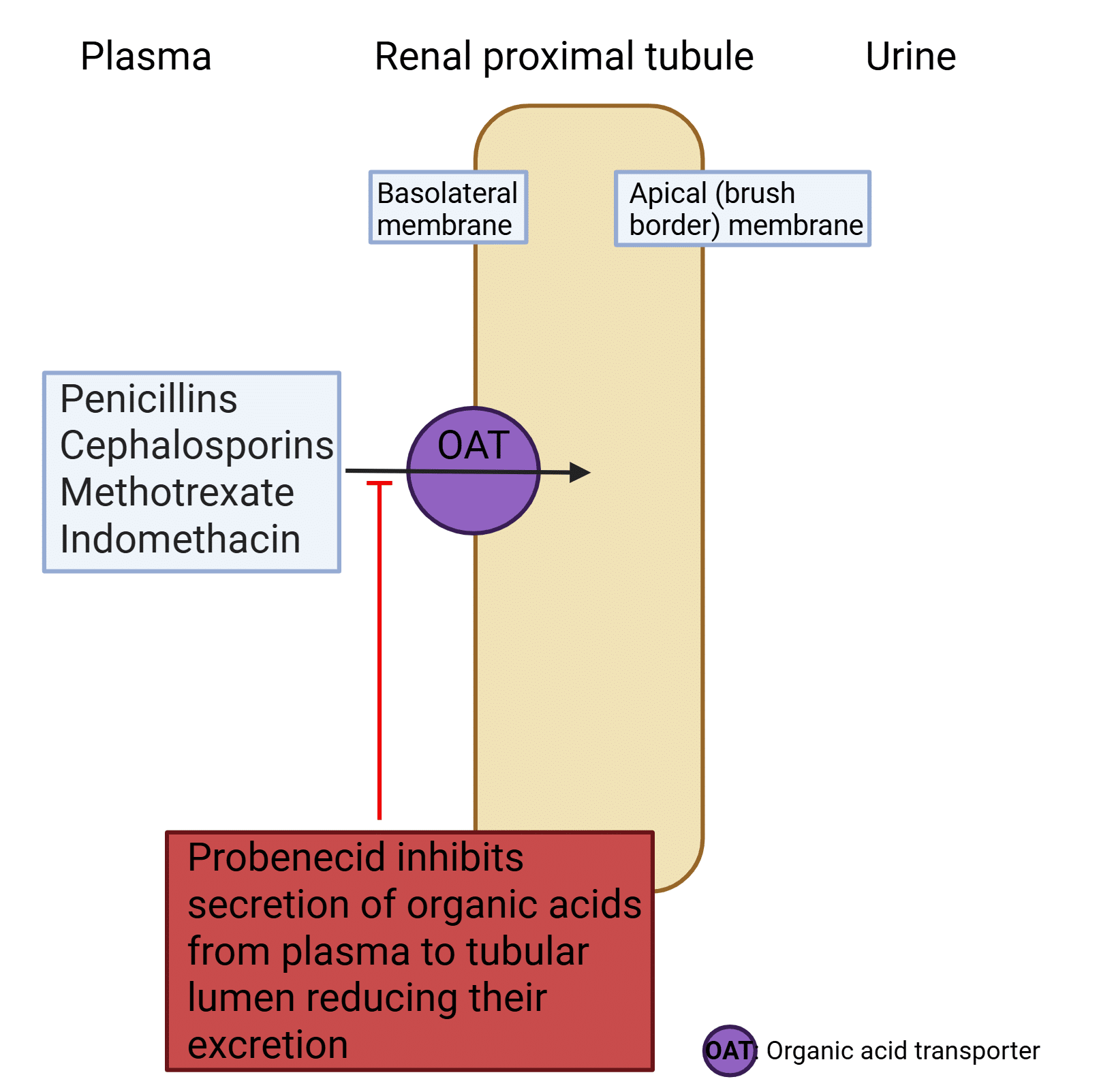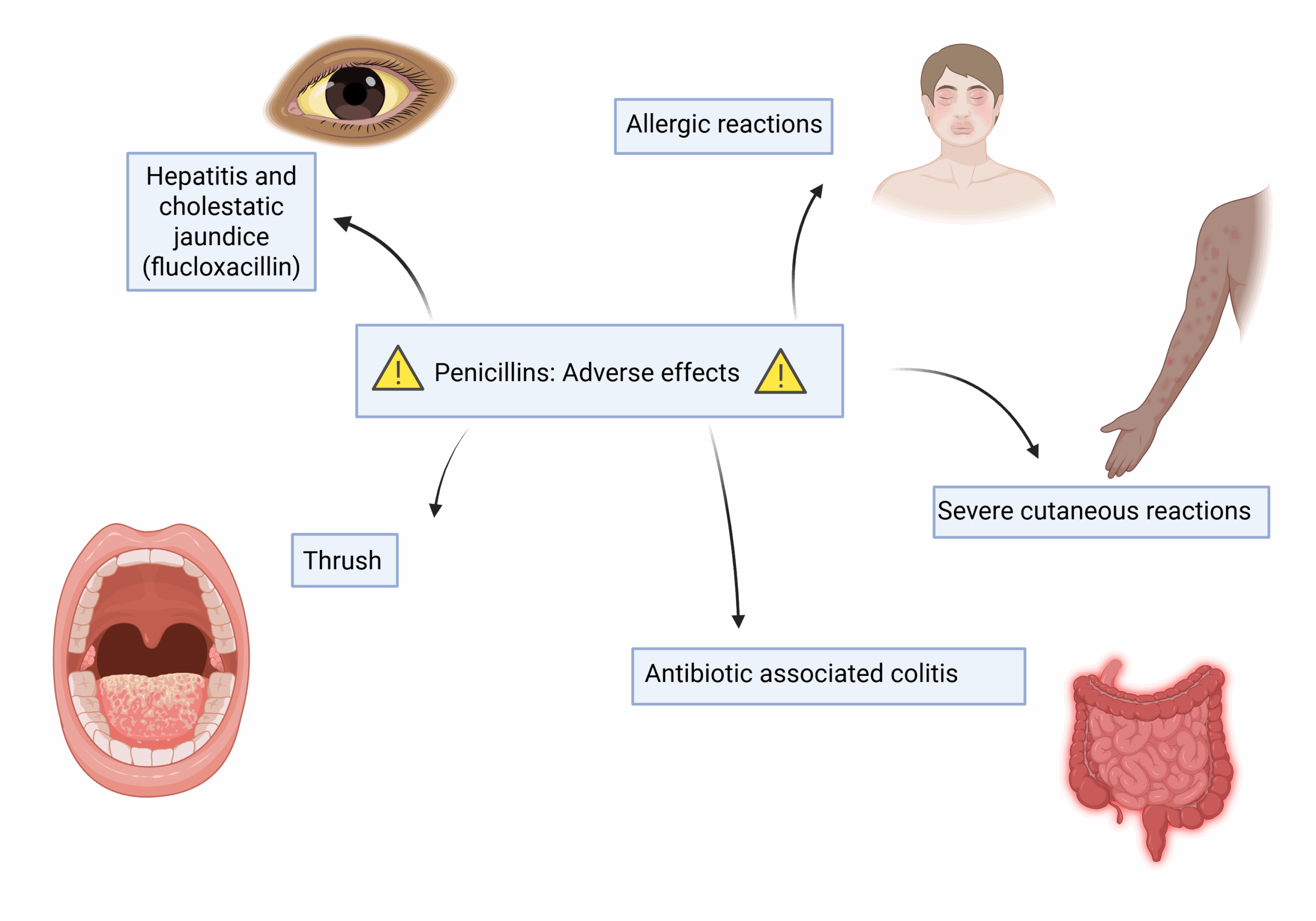 Although penicillins remain some of the most important and widely used antibiotics in clinical practice, their use requires careful consideration of safety. Allergic reactions are the most common contraindication, ranging from mild rashes to life-threatening anaphylaxis. In addition, penicillins are associated with a range of adverse effects and have several drug-drug interactions, which this article aims to outline. Contraindications A penicillin allergy is the most commonly reported drug allergy in the United Kingdom, and a history of severe and immediate hypersensitivity reaction to any 𝛃-lactam agent contraindicates the use for penicillins. However, estimations suggest that only ~20% of patients labelled to have a penicillin allergy, have a true allergy. Other contraindications for penicillin use include: Previous acute generalised exanthematous pustulosis (AGEP) Flucloxacillin – previous history of flucloxacillin-associated jaundice/hepatic dysfunction Pivmecillinam – impaired esophageal transit, genetic metabolism anomalies that would lead to severe carnitine deficiency. Pivmecilinam is a pro drug metabolised to pivalic acid and mecillinam (active metabolite), pivalic acid can increase urinary secretion of carnitine as it is excreted partly as a conjugate with carnitine. Genetic anomalies such as carnitine transporter defect, methylmalonic aciduria or propionic acidaemia can cause carnitine deficiency alongside pivmecillinam. Adverse Effects and Cautions Penicillins are generally safe and most commonly may cause mild gastrointestinal disturbance, thrush and antibiotic-associated colitis. Severe cutaneous reactions including AGEP, Steven Johnsons syndrome and toxic epidermal necrolysis have been reported. Renal impairment increases risk of bleeding manifestations (including abnormal clotting tests) and neurological complications e.g. convulsions (higher risk in a history of seizures, epilepsy or meningeal disorders) Interference with laboratory tests: urinary glucose test, Coomb’s test, urinary or serum protein tests, tests using bacteria such as Guthrie test Side effects and cautions specific for certain penicillins have also been reported: Amoxicillin Kounis syndrome – serious allergic reaction that can lead to myocardial infarction Jarisch-Herxheimer reaction – when treating lyme disease Crystalluria – more likely with IV amoxicillin therapy (frequency unknown) → kidney injury Flucloxacillin Very rarely hepatitis and cholestatic jaundice (not related to dose or route of administration, can be delayed for up to 2 months post exposure) Hyperbilirubinemia in newborns, due to displacement of bilirubin from plasma protein sites Hypokalaemia at high doses, which can be resistant to potassium supplementation Pivmecillinam Can cause acute attacks of porphyria Risk of carnitine depletion; symptoms include muscle ache, fatigue and confusion. Can cause interference with neonatal screening test for isovaleric acidemia Can lead to oesophageal ulcer/oesophagitis Phenoxymethylpenicillin Patients with a past history of rheumatic fever receiving prophylaxis should consider an alternative antibiotic choice as they may harbour penicillin-resistant organisms Markedly impaired renal function increases risk of encephalopathy Benzylpenicillin sodium Contains sodium (1200mg contains 3.36mmol of sodium) – care with patients on a sodium restriction e.g. heart failure Large doses → hypokalaemia and hypernatraemia – use of a potassium sparing diuretic may be required Jarisch-Herxheimer reaction may occur when using for syphilis Benzylpenicillin sodium is incompatible with solutions that contain metal ions and drugs such as amphotericin, cimetidine, flucloxacillin and methylprednisolone, in the absence of evidence of compatibility, benzylpenicillin sodium should not be mixed with other medicinal products. Piperacillin/tazobactam Can cause leukopenia and neutropenia (especially with prolonged therapy) Contains sodium (9.44mmol per vial) – care with patients on a sodium restriction e.g. heart failure Hypokalaemia may present in patients who are taking medicinal products that also cause hypokalaemia or in patients with low potassium reserves (uncommon side effect) Haemophagocytic lymphohistiocytosis (HLH) (especially with prolonged therapy) Incompatible with sodium bicarbonate, lactated ringers solution, and should be administered separately from other antibiotics (mixing piperacillin/tazobactam with an aminoglycoside can result in inactivation of aminoglycoside) Ampicillin Maculopapular rashes can occur with glandular fever, however this may not represent a true penicillin allergy Interactions General class effects: Bacteriostatic drugs such as tetracyclines may interfere with the bactericidal effects of penicillins Reduced excretion of methotrexate Penicillins readily and actively undergo secretion by renal tubules: probenecid decreases renal tubular secretion of penicillins, leading to increased exposure to penicillins Inactivate oral typhoid vaccine Sulfinpyrazone may reduce excretion of penicillins Drug-specific: Flucloxacillin With paracetamol: ↑ risk of high anion gap metabolic acidosis (very rare) Probenecid and sulfinpyrazone ↓ renal tubular secretion of flucloxacillin → ↑ exposure to flucloxacillin ↓ response to sugammadex ↓ voriconazole levels (CYP450 inducer) Pivmecilinam Valproic acid, valproate or any medications that liberate pivalic acid due to risk of carnitine depletion Phenoxymethylpenicillin Neomycin ↓ absorption of phenoxymethylpenicillin Piperacillin/tazobactam Vecuronium: prolongation of neuromuscular blockade when used with piperacillin Created in BioRender. Boucher, M. (2025) https://BioRender.com/p37cgu2 Fig 2: renal tubular secretion of drugs inhibited by probenecid and aspirin References https://bnf.nice.org.uk/treatment-summaries/penicillins/ accessed 13/2/25 Amoxicillin 500mg Capsules – Summary of Product Characteristics (SmPC) – (emc) acc