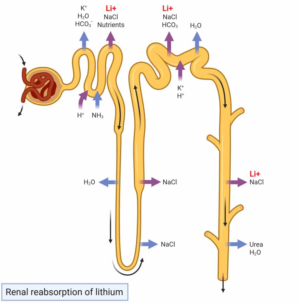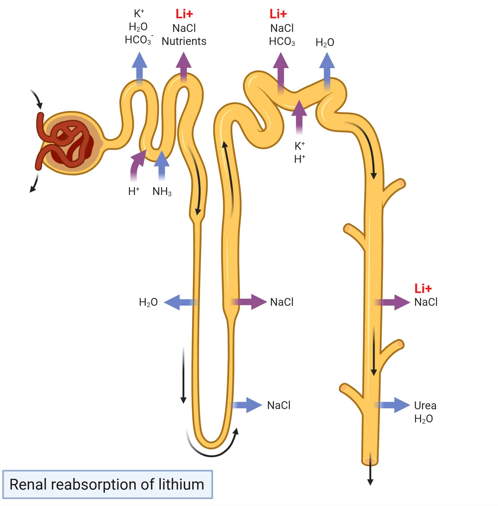 Lithium is a mood-stabilising agent used to treat a range of affective and behavioural disorders. It remains one of the most effective long-term therapies for bipolar disorder. Clinical Indications Acute manic or hypomanic episodes Depressive episodes resistant to antidepressants Prophylaxis of bipolar disorder (prevention of relapse) Control of aggression or self-harming behaviour The following article will describe the mechanism of action of lithium, key pharmacokinetic parameters, monitoring, contraindications and caution for use, side effects and clinically significant interactions. Mechanism of Action and Key Pharmacokinetic Parameters Although the exact mechanism is not fully understood, lithium is thought to: Modulate neurotransmitter production and turnover, particularly serotonin Block dopamine receptors Lithium is excreted via renal route and the elimination half-life ranges from 18 to 36 hours. Effect of Sodium on Lithium Levels Lithium and sodium compete for renal reabsorption (the kidneys treat lithium ions and sodium ions similarly) Lithium is largely absorbed in the proximal convoluted tubule (PCT), also in the distal tubule and collecting duct Sodium depletion → increased lithium reabsorption → toxicity risk. Patients should maintain a consistent salt and fluid intake. Created in BioRender. Boucher, M. (2025) https://BioRender.com/tw0kp4s Fig 1: Renal reabsorption of lithium Form Example Notes Lithium carbonate Tablets (e.g. Priadel®, Camcolit®) Modified-release formulations; doses not equivalent to liquid form Lithium citrate Oral liquid Used when tablets unsuitable Equivalence: Lithium carbonate 200 mg ≈ lithium citrate 509 mg When switching formulations or brands, re-monitor lithium levels due to potential bioavailability differences Monitoring Lithium possesses a narrow therapeutic window, so small differences in dose or blood concentration may lead to serious therapeutic failures or adverse drug reactions. Due to this, lithium requires therapeutic drug monitoring. Monitoring Parameter Timing / Frequency Target Range / Notes Lithium level 4–7 days after initiation or dose change Sample taken as a trough level, i.e. 24 hours after the last dose Target: 0.6–1.0 mmol/L Levels > 1.5 mmol/L indicate toxicity Renal function (U&E, eGFR) Baseline, then regularly Monitor for nephrotoxicity Thyroid function (TSH, T4) Baseline, then regularly Risk of hypothyroidism or goitre Cardiac function (ECG) Baseline, then regularly QT prolongation, bradyarrhythmia risk Contraindications Cardiac disease or insufficiency. Severe renal impairment. Untreated hypothyroidism. Breastfeeding Patients with low body sodium levels, including for example dehydrated patients or those on low sodium diets. Addison’s disease. Brugada syndrome or family history of Brugada syndrome. Cautions Epilepsy QT interval prolongation Avoid abrupt withdrawal due to risk of relapse May exacerbate psoriasis Interactions Increased Lithium Levels (Toxicity Risk) Drug Class Example Mechanism NSAIDs Ibuprofen, naproxen ↓ renal clearance ↑ nephrotoxicity risk ACE inhibitors / ARBs Ramipril, losartan ↓ renal clearance Thiazide diuretics Chlorthalidone, indapamide, metolazone ↓ renal clearance Metronidazole Metronidazole ↓ renal clearance Decreased Lithium levels Drug Class Example Mechanism SGLT2 inhibitors Empagliflozin, dapagliflozin ↑ renal excretion Caution with: Serotonergic agents → risk of serotonin syndrome QT-prolonging drugs → additive cardiac risk Drugs that lower seizure threshold Adverse effects Early (Often Transient) Nausea, diarrhoea Vertigo, muscle weakness Fine tremor Drowsiness or “dazed” feeling Long term/persistent effects Altered thyroid function Euthyroid goitre and/or hypothyroidism (risk appears to be greatest in the first 2 years of treatment and resolves upon stopping lithium) Thyrotoxicosis Electrolyte abnormalities Hypermagnesaemia Hypercalcaemia accompanied by elevations in circulating parathyroid hormone (PTH) suggesting primary hyperparathyroidism Nephrotoxicity A small reduction in glomerular filtration rate is seen in 20% of people taking lithium. Metabolic effects Weight increase Hyperglycaemia Neurological effects Tremor Benign intracranial hypertension (presents as a persistent headache and visual disturbance) Overdose Signs and symptoms of lithium overdose include the following: Mild Moderate Severe Nausea, diarrhoea, blurred vision, polyuria, lightheadedness, fine resting tremor, muscular weakness, drowsiness Increasing confusion, blackouts, fasciculation and increased deep tendon reflexes, myoclonic twitches and jerks, choreoathetoid movements, urinary or faecal incontinence, increasing restlessness followed by stupor. Hypernatraemia. Coma, convulsions, cerebellar signs, cardiac dysrhythmia (SA block, bradycardia, AV block), hypotension or rarely hypertension, circulatory collapse and renal failure. There is no antidote in lithium toxicity; patients electrolytes should be managed and monitoring should continue, gastric lavage for non-sustained-release preparations can be considered in certain situations and haemodialysis is the treatment of choice for severe lithium intoxication References https://www.medicines.org.uk/emc/product/13162/smpc#gref accessed 22.10.24 https://www.sps.nhs.uk/articles/specific-medicine-switches-for-solid-dose-and-liquid-formulations/ accessed 22.10.24 https://bnf.nice.org.uk/drugs/lithium-carbonate/ accessed 22.10.24 Do you think you’re ready? Take the quiz below Pro Feature - Quiz Lithium Question 1 of 3 Submitting... Skip Next Rate question: You scored 0% Skipped: 0/3 More Questions Available Upgrade to TeachMePharmacy Pro Challenge yourself with over 2100 multiple-choice questions to reinforce learning Learn More Rate This Article