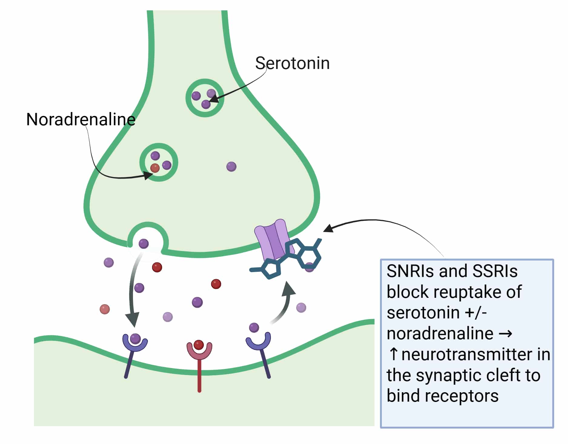 SNRIs Inhibit reuptake of both serotonin (SERT) and noradrenaline (NET)