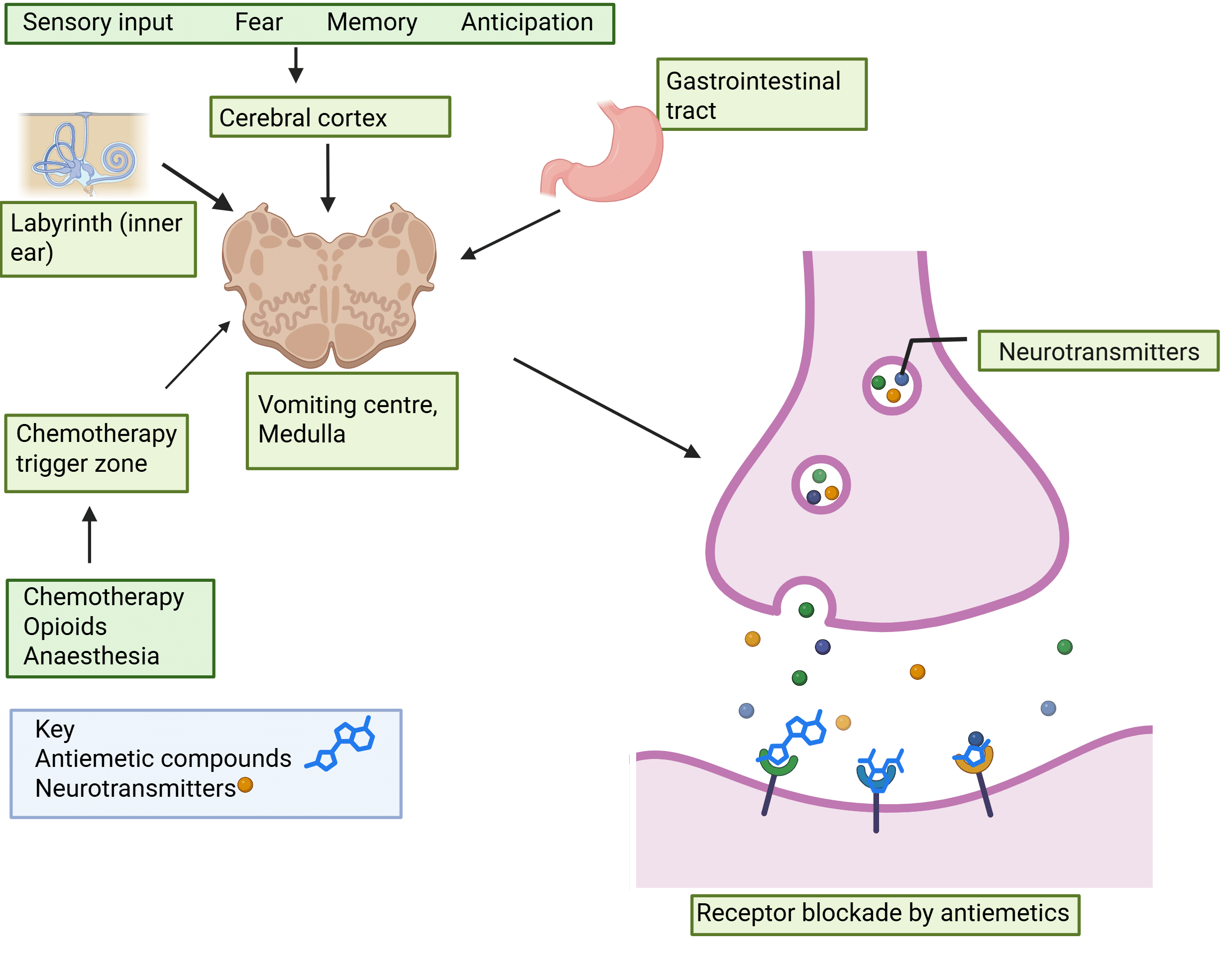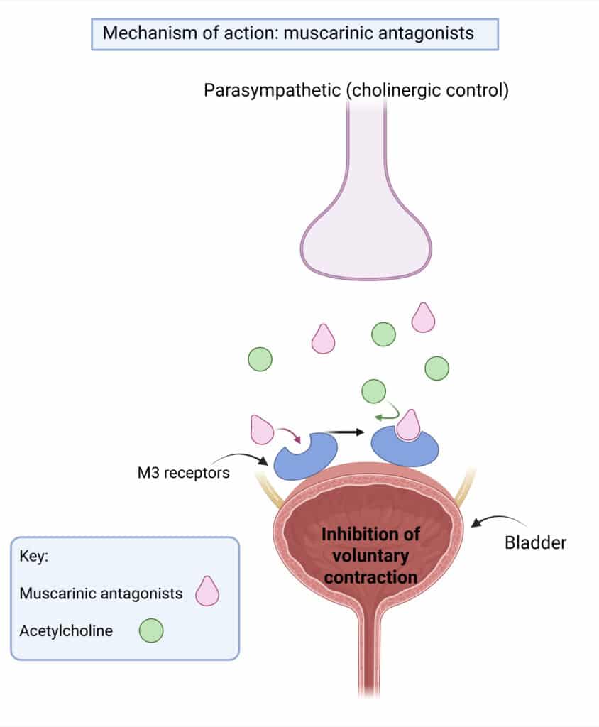 There are several different drug classes available to treat urinary incontinence. Antimuscarinic drugs for urinary incontinence include oxybutynin, darifenacin, fesoterodine, propiverine, solifenacin, tolterodine and trospium chloride. The following article will cover the antimuscarinic pharmacotherapy available for urinary incontinence, mechanism of action, cautions and contraindications, side effects and clinically significant interactions. Other treatment options include duloxetine and mirabegron. Mechanism Of Action The urinary bladder is innervated by parasympathetic cholinergic nerves. Acetylcholine contracts the detrusor smooth muscle through activation of muscarinic receptors (mainly M3 receptors which control urinary bladder muscle contraction). Urinary antimuscarinics antagonise muscarinic receptors and block acetylcholine from binding, leading to relaxation of smooth muscle, helping to alleviate symptoms of urgency, frequency, and incontinence. Selective M3 antagonists: Darifenacin, solifenacin, tolterodine and Fesoterodine are all selective muscarinic M3 receptor antagonists. Fesoterodine is also a prodrug which is rapidly and extensively hydrolysed to its primary active metabolite. Non-selective M3 antagonists: Oxybutynin: competitive antagonist at muscarinic receptors which is active at M3 and M2 receptors. Direct antispasmodic effect on the detrusor muscle of the bladder → reduces incidence of spontaneous contraction of the detrusor muscle in the bladder. Propiverine: non-selective muscarinic receptor antagonist. Also inhibits calcium influx and modulates intracellular calcium in urinary bladder smooth muscle cells causing musculotropic spasmolysis. Trospium chloride: high affinity to M1, M2 and M3 muscarinic receptors, competes concentration dependently with acetylcholine to do so. Created in BioRender. Boucher, M. (2025) https://BioRender.com/fy8guyx Fig 1: Mechanism of action: antimuscarinics for overactive bladder. Muscarinic antagonists such as solifenacin bind the M3 receptor and prevent acetylcholine from binding. This leads to inhibition of voluntary contraction of the bladder. Pharmacokinetics The following table describes the key pharmacokinetic properties of urinary antimuscarinic drugs: Antimuscarinic drug Bioavailability Tmax/steady state Metabolism Excretion Oxybutynin (tablets) F = 6% Tmax = 0.5 – 1 hour CYP3A4 Two phases: 40 minutes & 2-3 hours. Increased in elderly Darifenacin (MR tablets) F = 15-19% Tmax = 7 hours Steady state by day 6 Extensively metabolised in the liver by CYP3A4 and CYP2D6 (saturable). CYP2D6 is saturable therefore doubling the dose led to 150% increase in steady state exposure t½ = 13–19 hrs. Minimal renal excretion Fesoterodine (MR tablets) F = 52% (active metabolite) Tmax = 5 hours. Full treatment effect is observed between 2 and 8 weeks CYP3A4 t½ = 7 hours. The active metabolite is eliminated via hepatic and renal excretion; exposure increased in moderate renal/hepatic impairment. Propiverine (tablets) F = 40.5% Bioavailability ↑ with high-fat meals. Tmax = 2.3 hours. Weak CYP3A4 inhibitor/substrate Three active metabolites, all elicit pharmacological effect. t½ = 14-22 hours Solifenacin (tablets) F = 90% Tmax = 3-8 hours Maximum effect can be determined after 4 weeks of treatment Extensively metabolised by CYP3A4 Terminal half life = 45-68 hours Tolterodine (tablets) F = 17% (extensive metabolisers (EM)) – 65% (poor metabolisers (PM)) Tmax = 1-3 hours Effect of treatment can be expected within 4 weeks. CYP2D6 T½ = 2-3 hours (EM) – 10 hours (PM) 2x↑exposure of tolterodine in hepatic impairment, and 12x ↑ in renal impairment Trospium chloride (tablets) F~9.6% Bioavailability ↓ with high-fat meals. Tmax = 4-6 hours Limited hepatic metabolism T½ = 10-20 hours. Excreted renally; ↑ AUC and t½ in renal impairment. Cautions and Contraindications The following cautions and contraindications are applicable for antimuscarinic drugs for urinary incontinence: Cautions Contraindications In whom fast heart rates are undesirable e.g. cardiac history or hyperthyroidism QT prolongation (fesoterodine, solifenacin, tolterodine) Autonomic neuropathy. Angle-closure glaucoma Pyrexia Anticholinergic CNS effects – hallucinations, agitation, confusion, somnolence Gastrointestinal conditions Ulcerative colitis Diarrhoea Gastro-oesophageal reflux disease Hiatus hernia with reflux oesophagitis. Parkinson’s disease Renal and/or hepatic impairment and propiverine, tolterodine, trospium chloride, solifenacin Myasthenia gravis Severe hepatic impairment (darifenacin, fesoterodine, propiverine, tropsium chloride) Significant bladder outflow obstruction/urinary retention Toxic megacolon Antimuscarinics may decrease gastric motility: gastrointestinal obstruction, intestinal atony, paralytic ileus, pyloric stenosis, severe ulcerative colitis. Narrow angle glaucoma or shallow anterior chamber (oxybutynin, darifenacin, fesoterodine) Concomitant treatment with potent CYP3A4 inhibitors (darifenacin, tolterodine), alongside hepatic or renal impairment (fesoterodine, solifenacin) Haemodialysis and solifenacin Solifenacin and trospium chloride with galactose intolerance/Lapp lactase deficiency/glucose-galactose malabsorption Adverse Effects General, dose-dependent antimuscarinic effects include: System Adverse Effects Gastrointestinal Dry mouth, constipation, nausea, vomiting, dyspepsia Central Nervous System Drowsiness, dizziness, confusion, headache Cardiovascular Palpitations, tachycardia Urinary Tract Urinary retention Visual / Ocular Dry eyes, blurred vision, angle-closure glaucoma Dermatological / Others Flushing, skin reactions, rash, angioedema Interactions Class-wide interactions: Potentiation of anticholinergic effects with other anticholinergic agents e.g. amantadine, levodopa, antihistamines, antipsychotics, quinidine, TCAs, atropine, dipyridamole, baclofen, clozapine (constipation) Antagonise the effects of prokinetic therapies e.g.