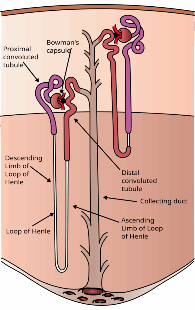 Loop diuretics, such as furosemide and bumetanide, are commonly used for pulmonary oedema secondary to left ventricular failure, coronary heart failure (CHF), and hypertension. Co-amilofruse, which contains bumetanide and amiloride, is another option. Loop diuretics increase urine output by acting on the loop of Henle in the kidney. This article reviews their mechanism of action, pharmacokinetic properties, contraindications, cautions, adverse effects and interactions for loop diuretics. Mechanism of action Ion transport occurs in the nephron, the functional unit of the kidney, which performs three main functions: glomerular filtration, tubular reabsorption, and tubular secretion. These processes filter blood, remove waste via urine, and regulate ion and water levels in the body. By Artwork by Holly Fischer - File:Kidney Nephron.png, CC BY 3.0, https://commons.wikimedia.org/w/index.php?curid=150397160 Fig 1: structure of the nephron The loop of Henle, part of the nephron, is responsible for approximately 25% of sodium reabsorption. It contains tubular cells with specific transporters: Na⁺/K⁺/Cl⁻ cotransporter: Reabsorbs sodium, potassium, and chloride from the tubular lumen into the cell in the ascending limb. Na⁺/K⁺ ATPase pump & chloride transporters: Move sodium and chloride from the tubular cell into the interstitial space. This creates a high concentration of sodium and chloride in the interstitial space, drawing water from the descending limb. Calcium and magnesium are also reabsorbed via paracellular transport due to a positive charge gradient. These ions and water are then absorbed into the bloodstream. Loop diuretics, like furosemide, inhibit the Na⁺/K⁺/Cl⁻ cotransporter in the ascending loop of Henle. This reduces sodium chloride reabsorption, increases urinary excretion, and promotes distal potassium secretion. Calcium and magnesium excretion is also increased, making loop diuretics highly effective for inducing diuresis. Other effects that furosemide elicits include: Reducing preload in heart failure by increasing venous capacitance Stimulating the renin-angiotensin-aldosterone system Upregulating endothelial prostaglandins Furosemide lowers blood pressure via volume reduction, increased sodium excretion, and reduced vascular smooth muscle response to vasoconstrictors. Kidney nephron molar transport diagram - File:Nephron-urine.svg - Wikipedia Fig 2: Secretion and reabsorption of various substances throughout the nephron Pharmacokinetics Furosemide and bumetanide have similar pharmacokinetics. Furosemide 40 mg is roughly equivalent to bumetanide 1 mg. High-dose substitution should be avoided; start at a lower dose and titrate gradually. Loop diuretics are usually administered in the morning; if twice-daily dosing is needed, the second dose is given at lunchtime to avoid nocturia. The diuretic effect lasts 3–4 hours. Parameter Furosemide (IV, IM, PO) Bumetanide (PO) Diuresis duration 4 hours 3 hours Tmax 1–1.5 h (PO) 1–2 h Bioavailability (F) 50–70% 80–95% Absorption Upper duodenum GI tract Plasma protein binding >98% 95% Metabolism Glucuronic metabolite (10–20%) No active metabolites Excretion 80–90% renal, remainder fecal 50% renal, 50% biliary/fecal Half-life 1–1.5 h (up to 24 h in renal impairment) 0.75–2.6 h (prolonged in renal/hepatic impairment) Contraindications Loop diuretics are contraindicated in: Severe electrolyte disturbances* (hyponatraemia or hypokalaemia) Hypovolaemia and hypotension* Addison’s disease (furosemide) Digitalis toxicity (risk of worsening hypokalaemia/hypomagnesaemia) Anuria CKD <30mL/min/1.73 m² (furosemide) Liver cirrhosis associated with comatose and pre-comatose state Renal failure resulting from poisoning by nephrotoxic and/or hepatotoxic agents Sulphonamide allergy (such as to co-trimoxazole or sulfasalazine) – possible cross-sensitivity with budesonide and furosemide Budesonide is contraindicated in patients taking lithium salts *These disturbances should be corrected before loop diuretics are started Cautions and side effects Monitor urea, creatinine and electrolytes during treatment. Loop diuretics can cause: hyponatraemia, hypocalcaemia, hypomagnesemia, hypovolaemia, hypokalaemia, increased creatinine and blood urea. Other cautions: Hypoproteinemia increases risk of ototoxicity and reduces efficacy with furosemide, therefore careful dose titration is required (e.g. in nephrotic syndrome, bioavailability is reduced by around 30%). Ototoxicity risk is due to higher concentrations of free furosemide (not bound to protein), whereas the reduced efficacy is due to intratubular albumin and decreased tubular secretion. Rapid IV furosemide can cause tinnitus/deafness; max rate 4 mg/min (2.5 mg/min in severe renal impairment) IM administration is reserved for exceptional circumstances Impaired hepatic/renal function – hypokalaemia associated with diuretic use can cause encephalopathy with impaired hepatic function Acute porphyria (furosemide) Diabetes mellitus – increased insulin requirements and can cause hyperglycemia Elderly – risk of hypotension, falls and renal impairment, increased risk of mortality when using furosemide with risperidone in the elderly Patients are risk of urinary retention e.g. in benign prostatic hypertrophy Gout – risk of hyperuricaemia Furosemide may inhibit lactation in breastfeeding mothers Exacerbation or activation of systemic lupus erythematosus (furosemide) Severe cutaneous reactions such as Stevens Johnson syndrome (SJS) and toxic epidermal necrolysis (TEN) Interactions Loop diuretics can interact with drugs that: Enhance hypotension: Antihypertensives, phenothiazines, MAOIs, TCAs Increase risk of hypokalemia: Other diuretics, antipsychotics, amphotericin, salbutamol, tacrolimus, corticosteroids Increase risk of cardiac toxicity in hypokalemia: Amiodarone, disopyramide, flecainide, sotalol, digoxin Increase nephrotoxicity: NSAIDs, cisplatin Increase ototoxicity: Amin